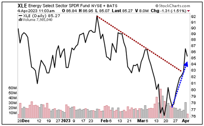 You can see the XLE was already rallying off its lows, and the OPEC+ news sent it surging through its downtrend. My preliminary target on the XLE is $109. But it could go higher than that.