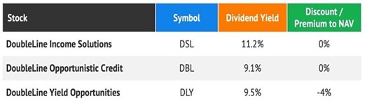 DLY wins the maraschino cherry award for this month. It’s run by the “Bond God” Jeffrey Gundlach and his crew, yields 9.5%, and trades at a 4% discount to its net asset value (NAV). A cherry indeed!