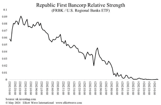 Another bank failure, another underperforming share price. Philadelphia-based Republic First Bank was closed down on Friday, April 26, and the assets were sold to Fulton Bank. Republic First became the first bank failure of 2024. Given our outlook for the stock market and the economy, it will probably not be the last, writes Murray Gunn, head of global research at Elliott Wave International.
