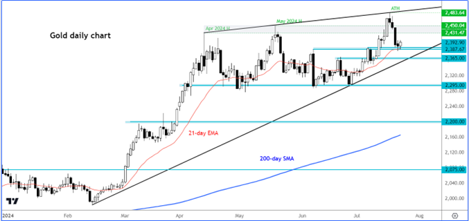 On the daily timeframe, gold has reached potential support between $2,385 and $2,400, where prior resistance meets the 21-day exponential moving average (EMA).