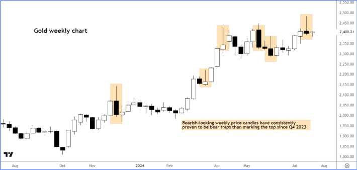 However, as highlighted in the chart, gold has exhibited similar bearish weekly price action several times since Q4 2023. In most cases, there has been only modest downside follow-through, with some candles completely engulfed by the next week's price action, indicating no real control by the bears. Last week's inverted hammer candle, although seemingly bearish, could turn out to be yet another bear trap.