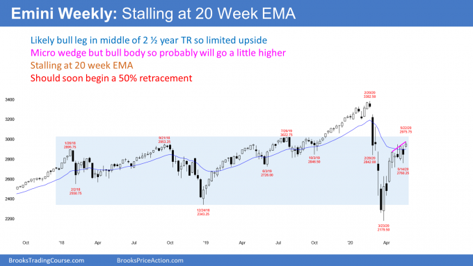 But, when a pullback is surprisingly big like that, traders expect at least a small second leg sideways to down. In 20% of cases, the second leg down begins after a brief new high. Consequently, traders believe that the E-mini will turn down for a month or two before making a new high. Therefore, the High 1 is a minor buy signal.