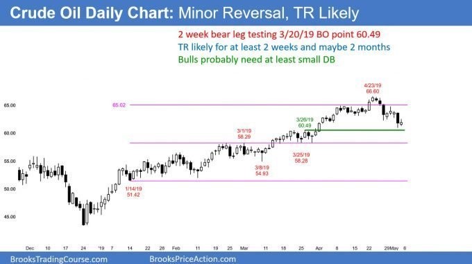 Traders are deciding where the bottom of the trading range will be. The first leg down will probably end around $60, but it could be at any of the 2019 higher lows. There will then probably be a bull leg in the trading range. Traders should expect at least two to three legs before there is a breakout up or down.