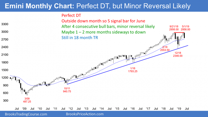 The monthly E-mini S&P 500 futures in May reversed down from above the April high and closed below the April low. May is therefore an outside down month. Furthermore, it formed a double top with the September all-time high. May’s candlestick is now a sell signal bar for that double top (see chart).