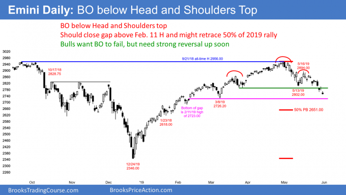 The daily E-mini S&P500 chart last week broke below the bottom of the three-month trading range. It also broke below the 2800 Big Round Number. The trading range was a head and shoulders top, which is always a lower high major trend reversal. Last week triggered the major trend reversal sell signal by breaking below the neckline of the head and shoulders top (see chart).