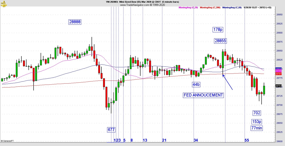 The charts of the day are the intraday Dow Jones Futures (YM) at the Fed announcement. It was one of the tamest sequences for any Fed announcement in the past few years (see chart below). In terms of the Kairos, there was a 44% retracement of the move up from Monday’s low. There was a mild breakout at 44 bars on a 5-minute chart from the high. It didn’t last as the 178 point move off the 28,677-low stalled at 28,855. You guessed correctly, it stalled at 56 bars. It proceeded to break below that ridge but was only mildly bearish. The last part of the sequence was a low at 77 minutes. Kairos precision works both ways. If you were long, there is a statistical condition called variable change. If you saw the movie 21, the protagonist Ben Campbell stated his nonlinear professor Micky Rosa told him to always account for variable change. In trading that means to understand what could be coming against you. Coronavirus may very well be the variable change coming against the market.