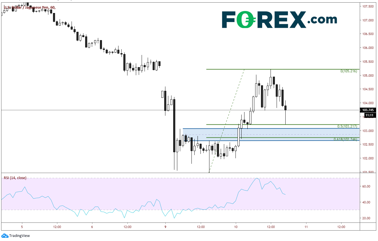 After rallying from 102 to 105 earlier in the session, the Japanese yen began to rollover as market felt Trump did not deliver on the payroll tax cut. Support comes in at the 50% retracement level of this week’s range near 103.21, then a band of support from 103.05 down to 102.70. Below that, final short-term support is 101.18, this week’s low (see chart).