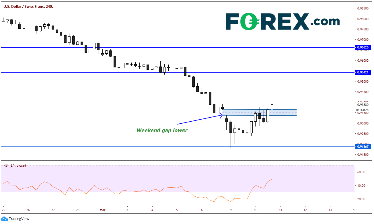 What does this mean? The Coronavirus is still out there. A fiscal stimulus package is helpful, but as Fed Chair Powell said regarding the 50-bais-point interest rate cut last week, stimulus will not stop the Coronavirus. It will just help those who are affected by it. This means that although U.S. government officials are finally moving in the right direction, stocks can still move lower. Because stocks did not fill the gap from Sunday night, there is still a lot of work to be done if they want to move higher. USD/CHF bears are still watching the flight to safety trade. They are hunting the trade in which stocks turn lower and they can jump in again and look to take out the February 2018 lows.