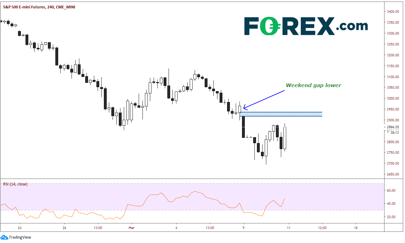 All is right again, right? Not quite. Although the S&P 500 closed up 4.8% on the day, it could not fill the gap from Sunday night at 2916. The actual gap fill is Friday’s close at 2984.25. Price is still more than 100 handles away from that point. The first resistance is 2916 (the gap open) and the second resistance is 2984.25 (see chart).