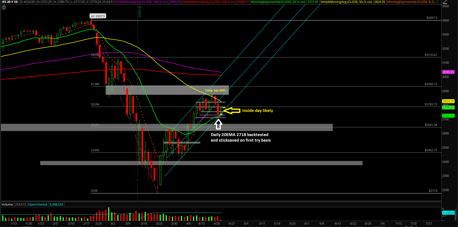 In essence, this is the area where the big bad bears will be looking closely for a pre-determined low risk versus high reward playbook setup. Whether they succeed or not remains the billion dollar question, but they will definitely try their hardest for the turn and supposedly climax of this current move based on the setup, statistics and historical data. As of writing, we’re treating the 2885 ES level as a temporary top; the temporary floor was at around 2718 from yesterday’s 20-day EMA backtest.