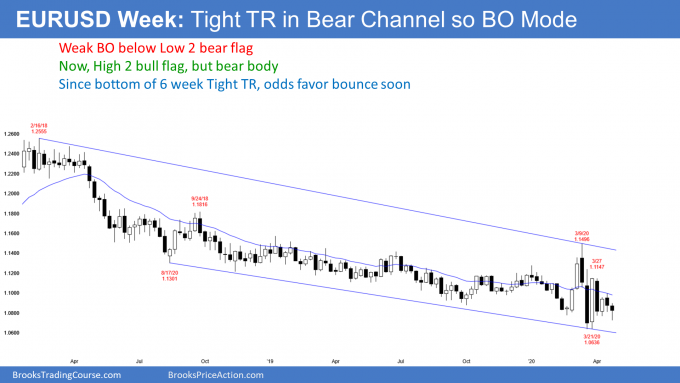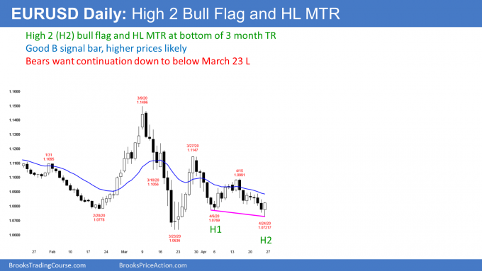 However, the breakout has been weak. Friday was a bull day and therefore a buy signal bar. The bulls see Friday as forming a higher low major trend reversal. In addition, it is the end of two legs down from the March 27 rally. There, it is also a buy signal bar for a big High 2 bull flag.