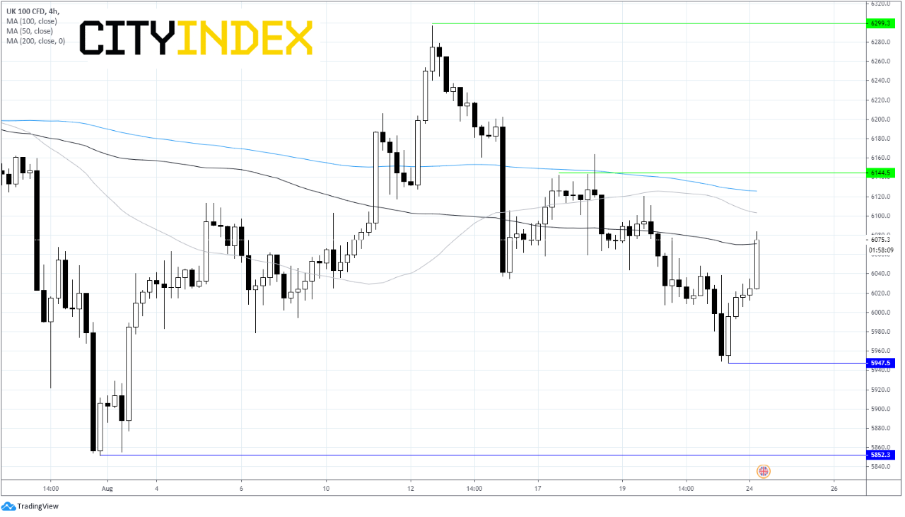 The economic calendar is light early this week, meaning investors will be vulnerable to risk sentiment and coronavirus statistics. As the week progresses German GDP data and US GDP figures will be in focus ahead of the virtual annual Jackson Hole symposium, which kicks off Thursday. Here investors will be listening closely for clues as to where the Federal Reserve intends to take monetary policy.