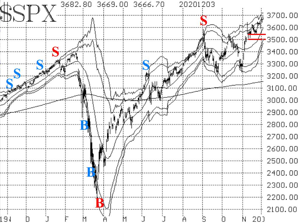 In summary, the market is overbought and getting more so almost every day. However, there are no sell signals present, and so we remain bullish. Simply stated, we remain bullish as long as SPX is above 3500.