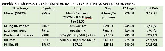 Next week I am concentrating on buying stocks in seasonally strong sectors that include Insurers with Prudential (PRU), Energy with Phillips 66 (PSXP), Materials with DuPont (DD) and Mosaic (MOS), along with Raytheon (RTX) in Aerospace/Defense with one beverage company, Keurig/Dr. Pepper (KDP). Entries stops and targets are posted in the table below.