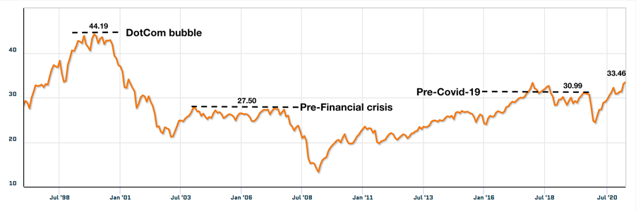 The ratio is currently at 33.46, which is higher than pre-2008 valuations, but 24% below the peak of the dotcom bubble. Assuming little has changed in the way firms do business since this time last year, valuations are looking lofty but there is still plenty of gas in the tank compared to the DotCom days.