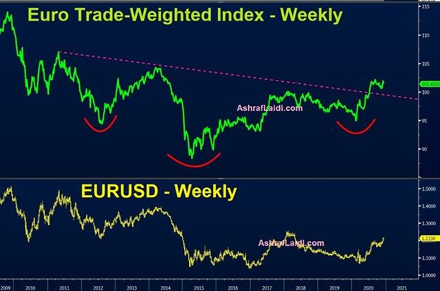 You've all heard of the USD Index. Here is the euro index below. Euro firms above the 1.2100 after raising the PEPP by EUR 500 bn by nine months, while revising the inflation outlook to below 2% target through 2023, says Adam Button of ForexLive.com.