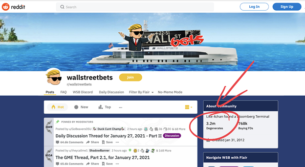 On the 26th everything started, the stock closed up almost 93% at $147.98, and it rose as high as $380! I’ve seen crazy things in this market, but a Reddit crowd squeezing shorts to this extent. It’s just crazy. The WallStreetBets group on Reddit—the one whose purpose is “making money and being amused by it,” their words, not mine—is growing by leaps and bounds. Tuesday, it had 2.3 million users, but Wednesday, there were 3.2 million users!