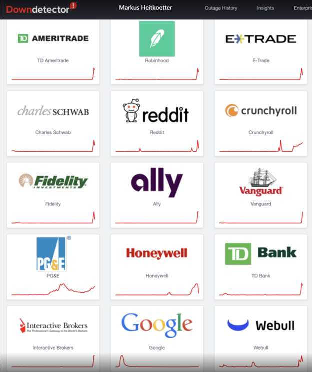 This has caused such crazy trading volume that a bunch of online brokers crashed. Here’s a screenshot from DownDetector.com that I took: