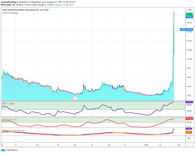 This Reddit crowd is targeting some other highly shorted stocks too, so I want to take a quick look at their charts. First up is AMC (AMC). On Tuesday, the 26th, it closed at $4.96, and hit a high of $20.36 earlier. Wednesday it was up 229% at $16.27.