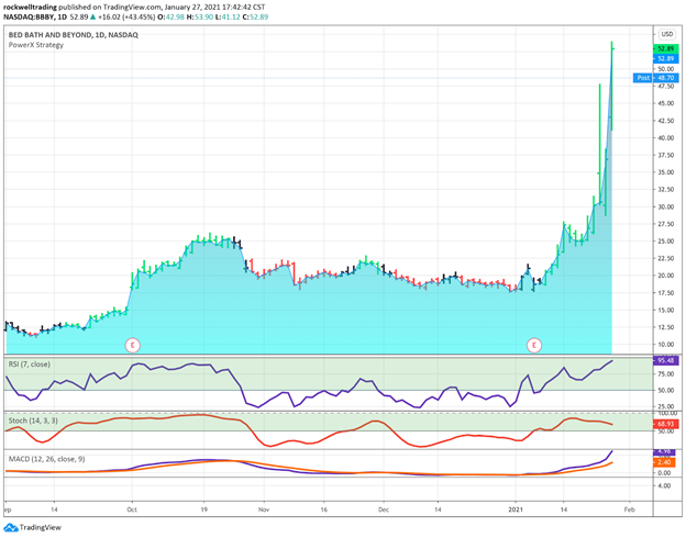 Next is Bed Bath & Beyond (BBBY). It traded as high as $53.90—its highest level since 2015! BBBY closed up 24% at $45.79 shortly after.