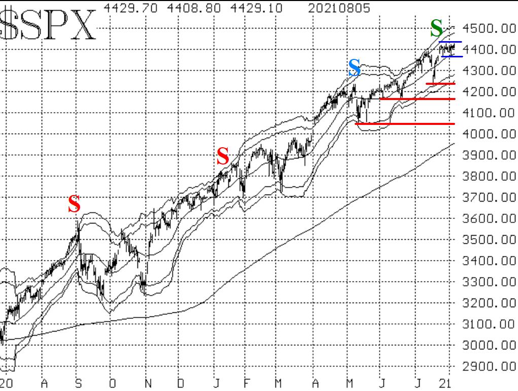 Overall, we are in much the same situation that we've been in for a while: SPX is strong, and some of the internals of the market are weak. We continue to recommend holding a "core" bullish position as long as SPX is above support at 4370, and one should trade confirmed sell signals around that bullish "core."