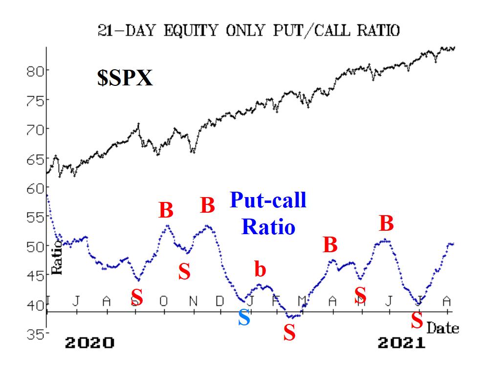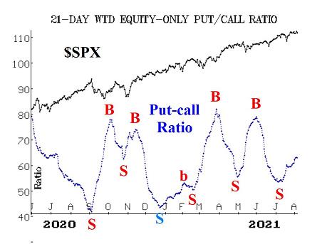 So, SPX is closing at new all-time highs, but there are several indicators that are far from confirming that. That means a negative divergence has developed in some areas. The first is in the equity-only put-call ratios. These ratios remain on sell signals, as they continue to climb.