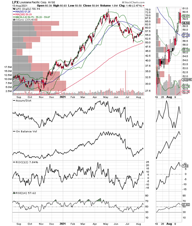 Indeed, that’s what’s happened as the $76 area was finally breached and XHB has moved steadily higher. Meanwhile, I’ve also noted that the lumber stocks, specifically Louisiana Pacific (LPX) also seemed ready to move higher, which again has been the case.