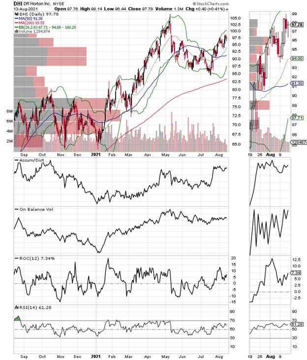 DHI, the proxy for new homes, has been forming a base in a comfortable area of complexity above its 200-day moving average of late and recently took out short-term resistance at $97.