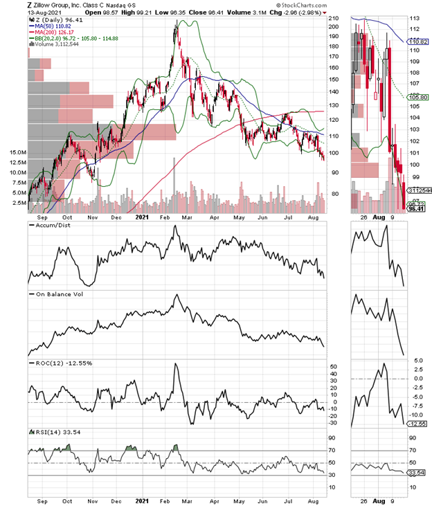 Meanwhile, Z, the proxy for existing homes waiting to be flipped is in the chaos zone well below its 200-day line and looking as if it may begin to form a base in the next few weeks. What this difference in stock price suggests is that in a difficult market, buyers are more willing to pay high prices for new homes with a lower potential for needing repairs. It may also be suggestive that since new home subdivisions are more likely to be in less populated areas than existing homes, this may be an attractive option for buyers.