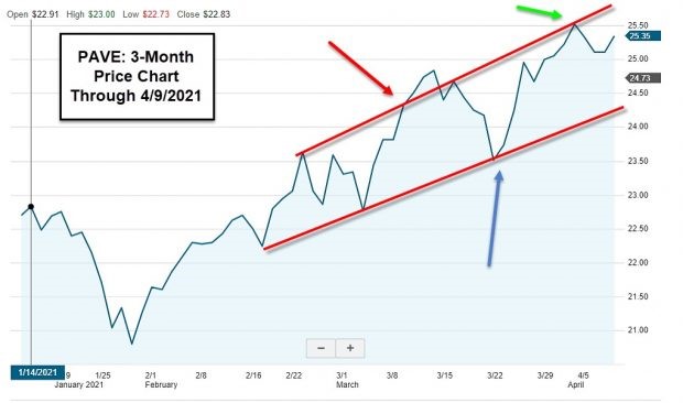 PAVE closed on Friday April 9 at $25.35 with a trade breakeven at $25.38. Final results can go either way. At this point in time, the best action may be no action at all.