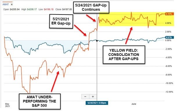 On Friday, 5/21/2021, AMAT announced a stellar earnings report resulting in the gap-up as the May contracts expired. There was a 5.2% earnings surprise and a 3.2% revenue surprise.