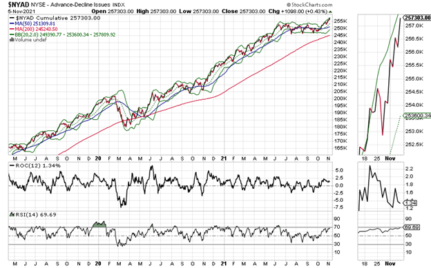 The New York Stock Exchange Advance Decline line (NYAD) has finally delivered a convincing breakout, although it could enter a short-term consolidation pattern in the next few days. Still, for now, the indicator remains bullish, although slightly overbought.
