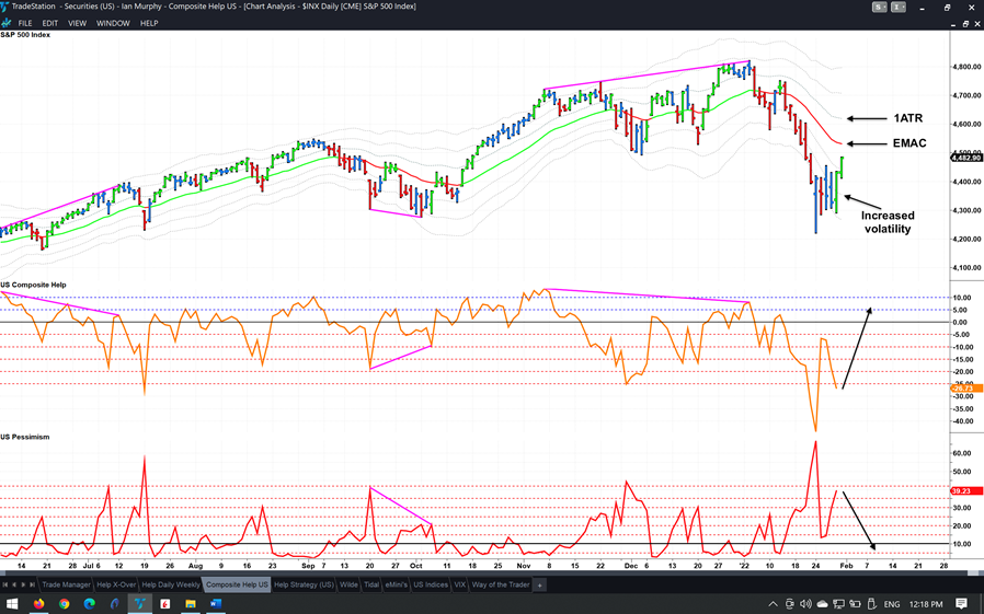 For the bull market to resume, the index needs to close above the moving average followed by the 1ATR line (marked). On the other hand, if we are in the early stages of a bear market, the index will fail to establish a foothold above these levels and will fall again forming a second lower high in the process. Also, Composite Help (orange line) and Pessimism (red line) will have to reverse course dramatically if this market is going to recover.