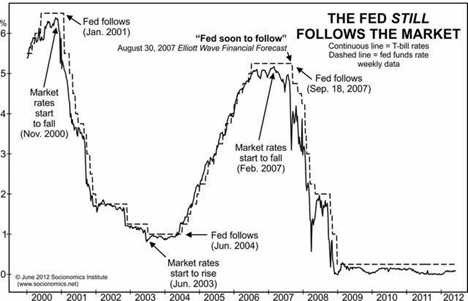 Now, for those of you that believe that the Fed leads when it comes to interest rate moves, I have some bad news for you. It is a complete fallacy! You see, it's the market that controls interest rates. It has always been this way, and it will always be this way. The market is much stronger than the Fed. And this chart from The Socionomic Institute proves it.