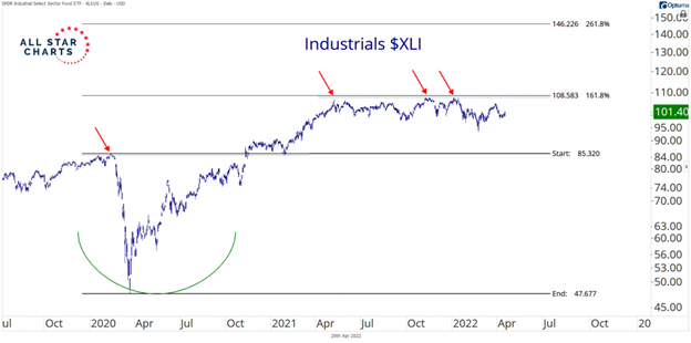 As a team, we zeroed in on either the Financials (XLF) or the Industrials (XLI) as being the likeliest leaders of a bearish sentiment unwind that sees investors scrambling to get reinvested into a rising market. These sectors are currently among the relative strength leaders and leaders are likely to continue leading. Here’s how the XLI chart looks: