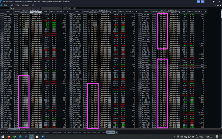 After that, I just sit back and let the screener cycle through the 2600 stocks every 30 seconds of the day looking for setups as they occur in real-time. Something to note when using a screener—we can go for days without getting a single good trigger and it can be challenging to sit around as we are tempted to take second-rate setups. Then something changes in the market, and we get a cluster of triggers all at once (look at July 15, June 17, and Jun 15 above)—it’s as if we go from a famine to a feast. Then the challenge becomes which of the triggers to take.