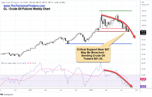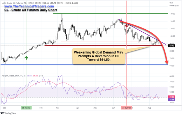 I suspect the current demand destruction related to inflationary trends, high gasoline prices, and the threat of another global house price peak may be sending consumers into a similar contraction cycle. This is why I believe Crude Oil will slide below the $87 price level and attempt to find new support near $61 before we see any real upward price trends in the energy sector.