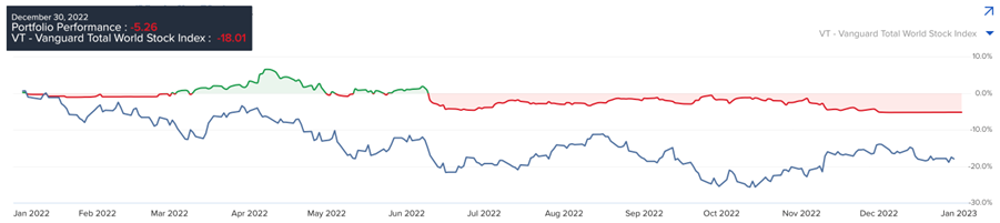 In hindsight, 2022 was not the best year to demonstrate the strategy, but it was a great year to display the power of active risk management. When benchmarked against the Vanguard Total World Stock ETF (VT) the IB account lost just 5.26%, while global stock markets were down 18.01%. In the US, the S&P 500 (SPX) fared even worse by shedding 20.3%, and the tech-heavy NASDAQ index saw a whopping decline of 33%. In addition, some high-profile money managers were left with eggs on their faces including the super-confident Cathie Wood who oversaw an eye-watering decline of 67% in her firm’s flagship ARK Innovation ETF (ARKK).