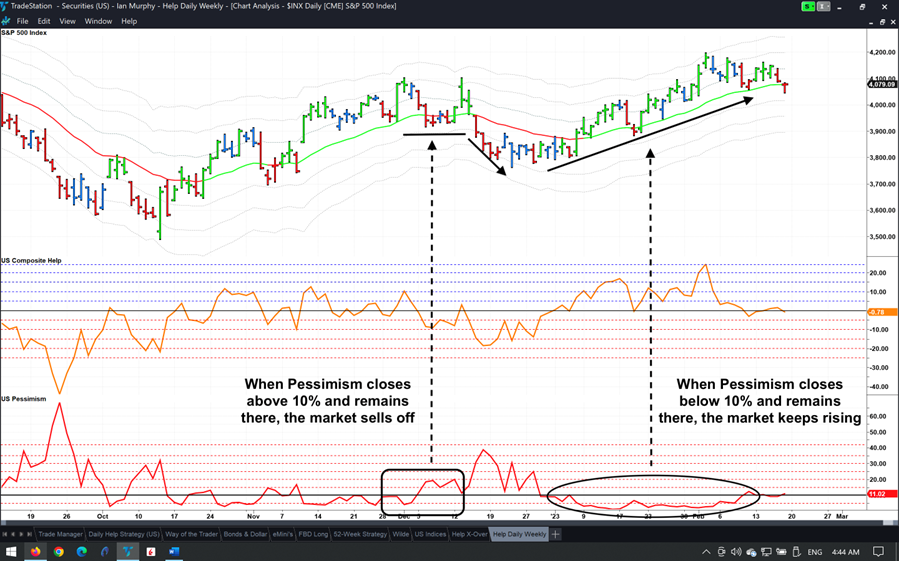 As we have seen throughout January and earlier this month, when Pessimism drops below 10% and stays there, the markets are more likely to keep rising (oval). However, when Pessimism crosses above 10% and stays elevated the likelihood of a selloff increase (rectangle). The key thing to look for is a crossover of the 10% line—notice how it flagged the selloff last December about a week before it happened.