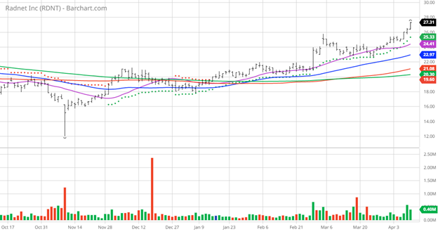 The chart of the day belongs to the diagnostic imaging company RadNet (RDNT), states Jim Van Meerten of BarChart.com.