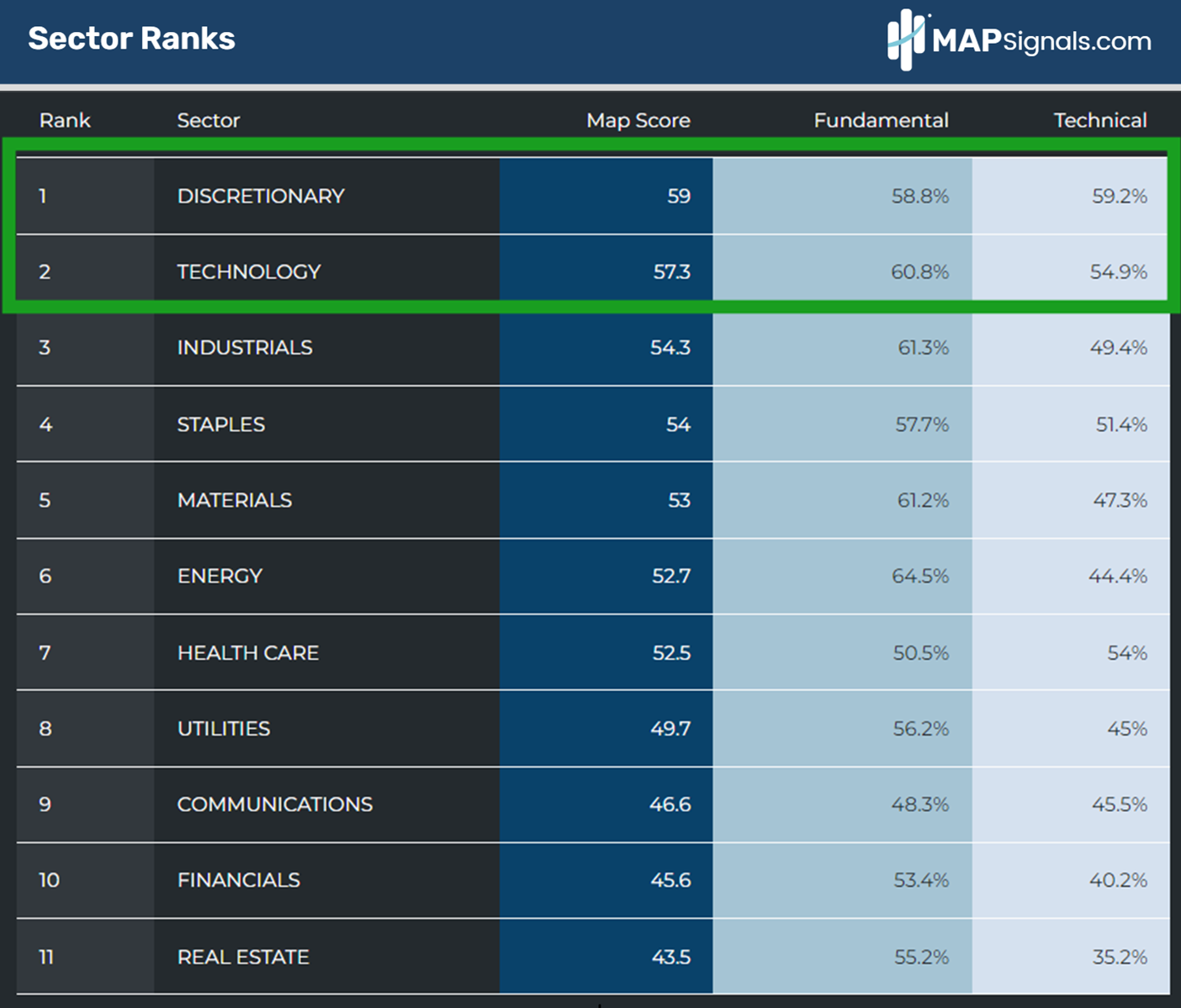 My conviction only amplifies in these two areas given their leadership position all year. Below, you’ll see how Tech and Discretionary reign supreme in terms of our proprietary scores: