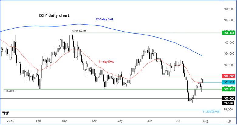 Fed Chair Powell made it quite clear that US monetary policy was now restricted enough and that the next policy decision in September would be entirely data-dependent. Until then, we will have two more inflation and a couple of job reports to consider. While the focus is clearly on inflation as employment is still very strong, any potential weakness in jobs data could cement expectations of a policy hold. But another surprisingly strong employment report would keep the threat of further Fed hikes alive.