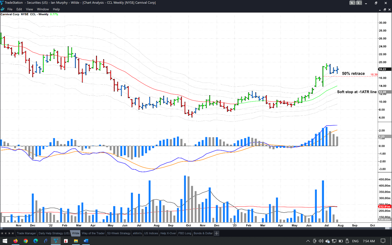 On the Weekly Trend Following Strategy, Carnival Corp. (CCL) appears to have found support at a 50% retrace of the tall price bar which was printed in the last week of June. The trailing stop at $12.48 is almost $6 from the current price so there is plenty of room for this to pull back for breath without flashing an exit signal.