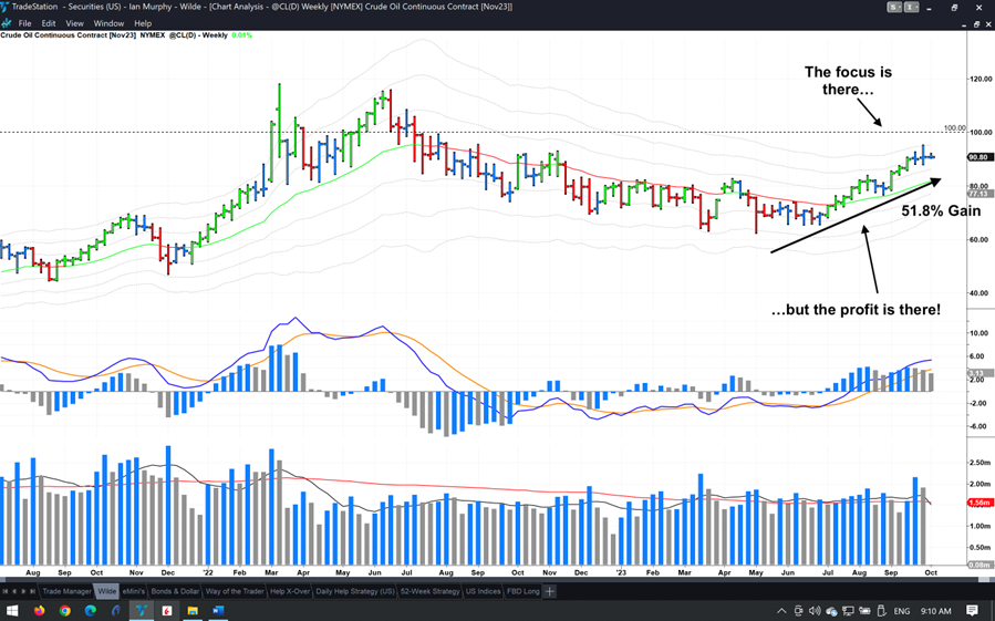 Another headwind that crept up silently on consumers over the late summer and early fall is the incessant rise in oil prices with the media fixated on the symbolic $100 level. As an active investor who tries to identify new market trends in their infancy, the 51.8% increase in crude prices since the week ending May 5 is significantly more important than a round number. If we can catch two or three of these multi-month moves with a significant chunk of our account, we will prosper as traders and active market investors over a year.