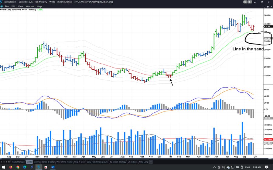 I prefer a lag-dependent approach which gives more room for a stock to pullback, and in the case of Nvidia Corp (NVDA), I would use a weekly chart with a soft trailing stop on a closing basis on the -1ATR line (line in the sand). Whenever I’m asked about a stock this is the first chart I look at because we can see immediately what the current trend is.