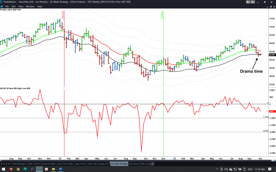 The position in this strategy endured a bit of drama last Friday when it looked as if the trade might need to be closed for just the second time in nine months. Throughout the week the price bar on the 2x ProShares ETF (SSO) flirted with the exit point (-1ATR line as mentioned above) only to recover in Friday afternoon’s session to finish out the week just above the line.
