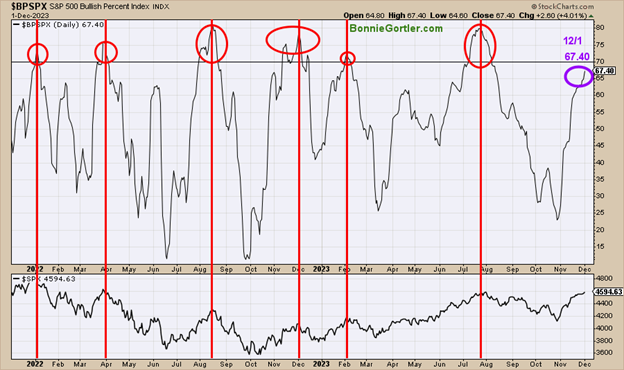 In 2022 and 2023, the indicator reached 70 (overbought) six times (red circles). All occurrences were near market peaks (red lines). The BPI closed at 63 (purple circle), getting closer to achieving the 70 level if there is continued strength in the SPY. A reading over 70, followed by a retracement below 70, would give a sell signal on this indicator. For now, the BPI is rising and on a buy closing at 67.40, getting closer to 70. This week will likely tell if BPI has the strength to get above 70 or if it will turn lower before reaching 70 (overbought).