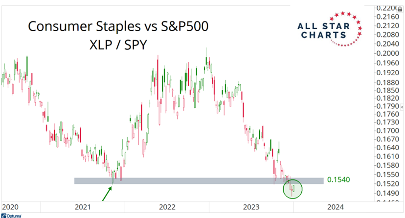 As money went into stocks and other risk assets throughout 2023, a lot of money flowed out of the more defensive areas. Consumer Staples were front and center, as they usually are during bull markets. Historically, consumer staples underperform during healthy market environments. It's when they outperform that stocks in general are usually under pressure.