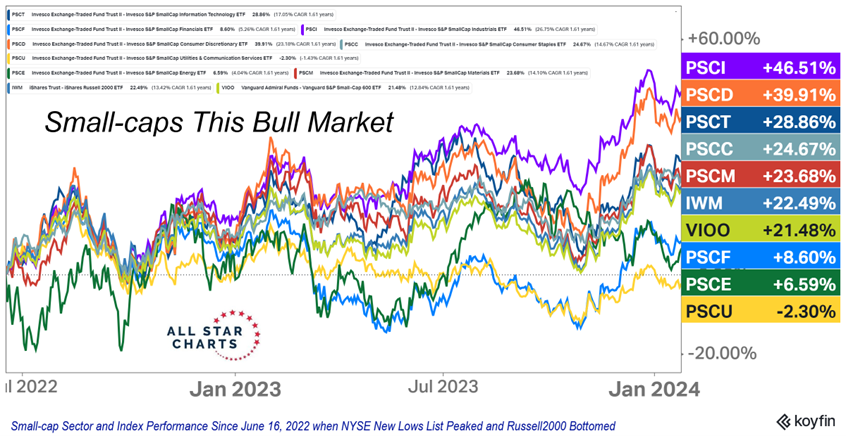Small-cap Industrials are up over 46% in this bull market. Small-cap Consumer Discretionary is up 40%. And Small-cap Tech is up almost 30%. The thing to remember is that there are 250 biotech stocks in the Russell 2000. You also have another 250 or so regional banks in the index.