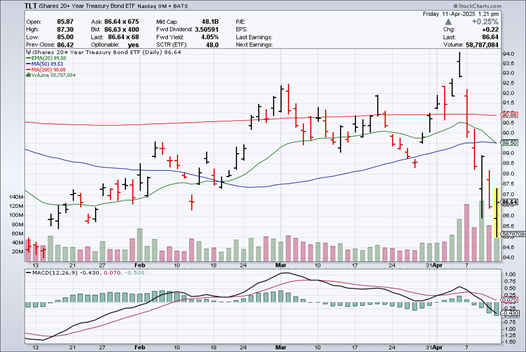 As for the iShares 20+ Year Treasury Bond ETF (TLT), which moves inversely to yields because it tracks bond prices, it tanked to as low as $85 on April 11 from just over $94 on April 7. It’s not very often TLT loses around 10% in five trading days, as you can see it did in this MoneyShow Chart of the Day. As a matter of fact, this was the third-worst week for TLT since this century began!